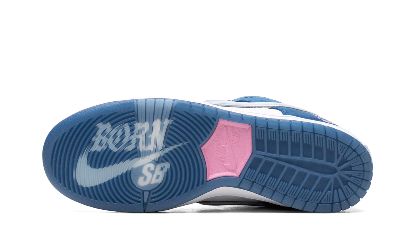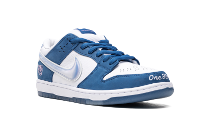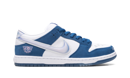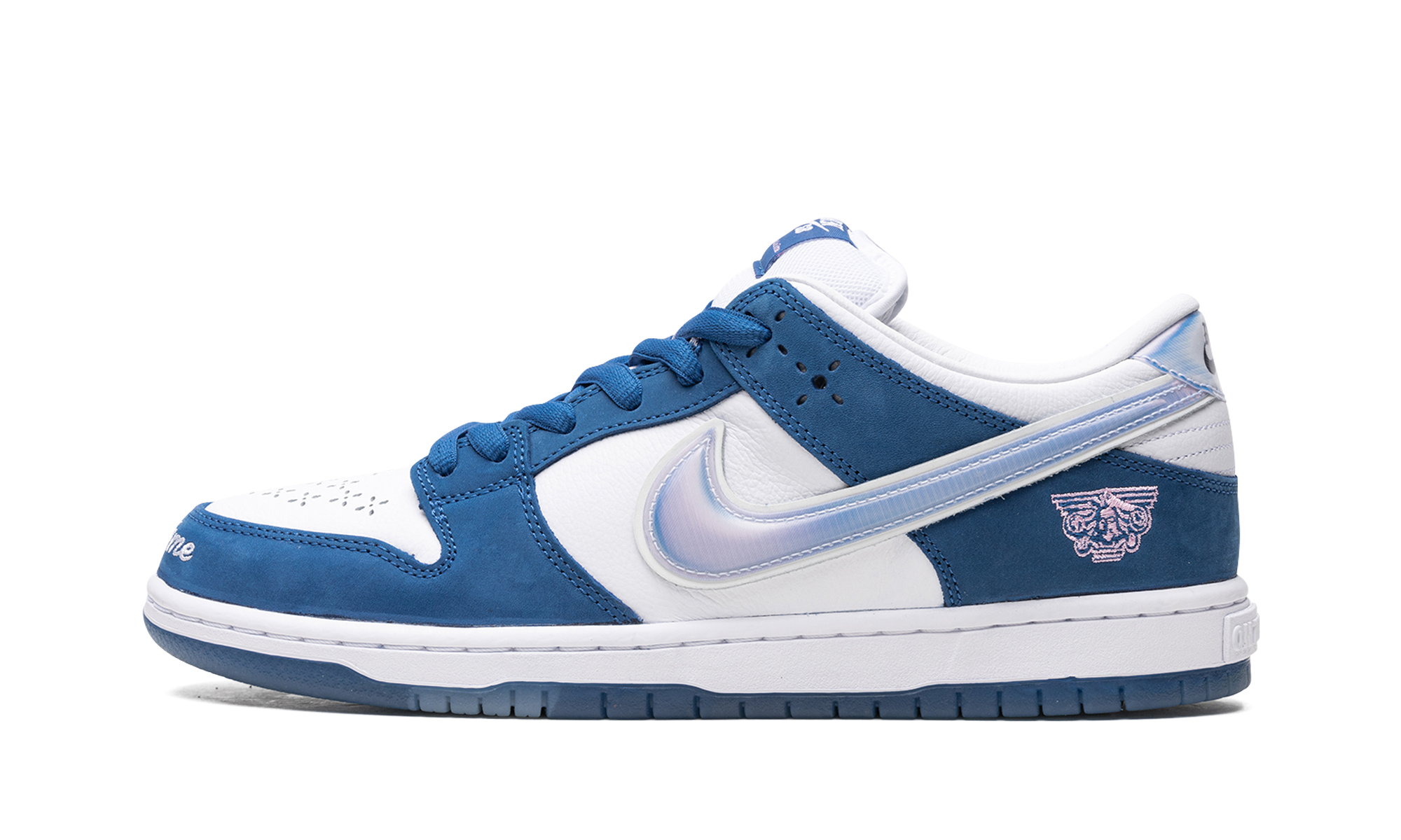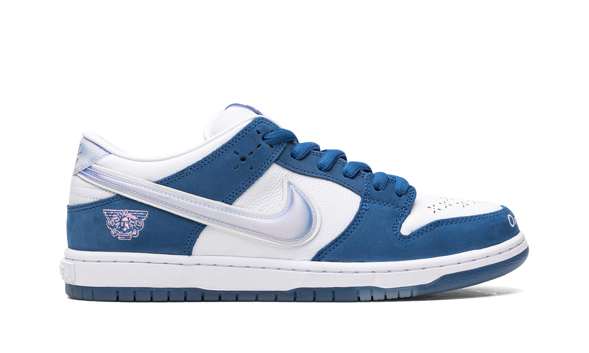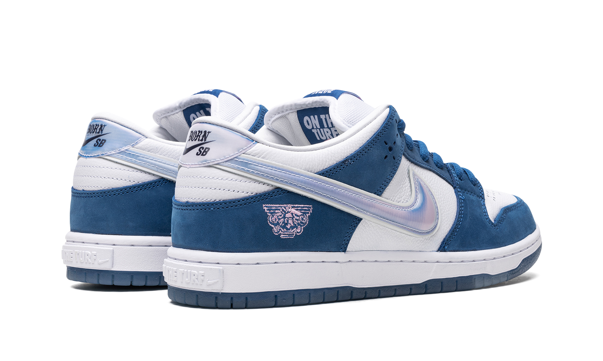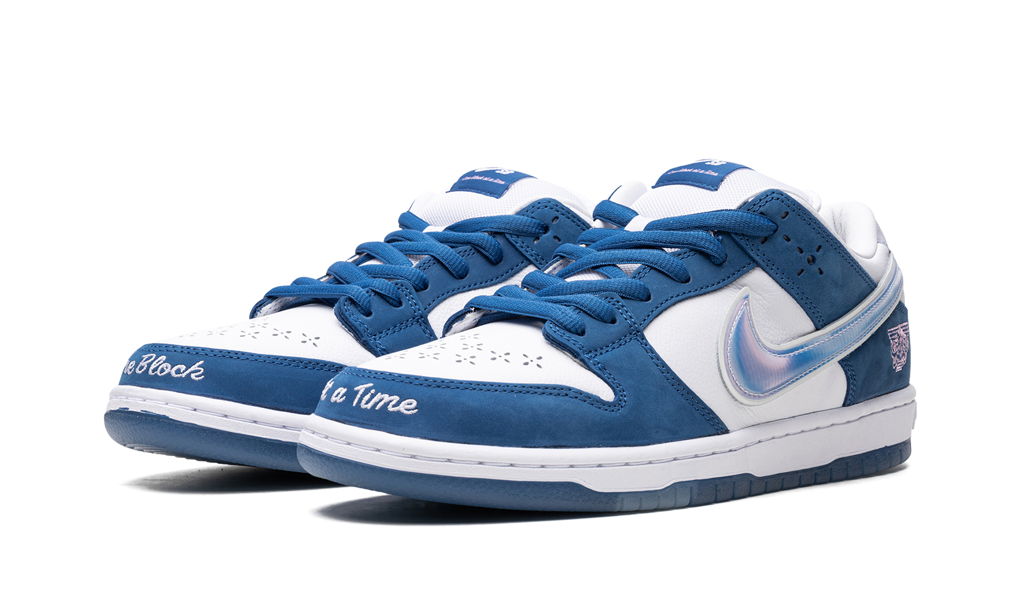 The Born x Raised x Nike SB Dunk Low “One Block at a Time” is the first-ever collaboration between the California-based streetwear brand and Nike SB on the iconic skate shoe. The “One Block at a Time” SB Dunk by Born x Raised features a decidedly “Los Angeles” look, as the shoe’s white and blue color block is undoubtedly inspired by the Los Angeles Dodgers’ team uniforms. The shoe features a white leather base with blue nubuck overlays and unique perforations on the toe. “One Block at a Time” is embroidered on the front of the toe cap across both shoes. A pink branding emblem appears on the lateral side of the heel. The side Swooshes are featured in an iridescent material with a puffed effect. The shoe is mounted on a white rubber midsole. A “Born SB” graphic is found underneath the clear rubber outsole. Release date: June 1, 2023