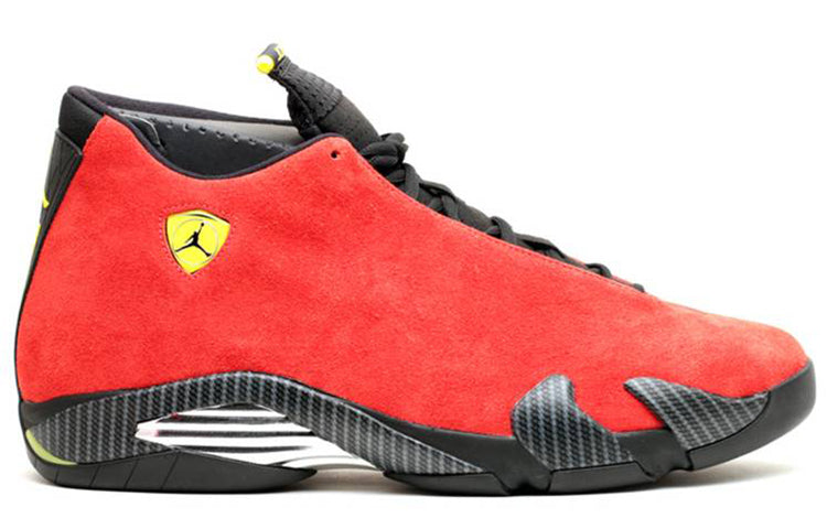 The Air Jordan 14 Retro 'Ferrari' will add some luxury to your step with its varsity red suede upper and black and vibrant yellow accents. This sneaker was originally limited to Chicago retail stores during the August 2014 World Basketball festival and is now available to a wider audience. The design includes Carbon Fiber shark teeth on the midsole and a chrome grill shank plate that also pay tribute to Ferrari. Whether you're a fan of the iconic sports car or just want to add a little luxury to your step, the Air Jordan 14 Retro 'Ferrari' is a must-have sneaker.